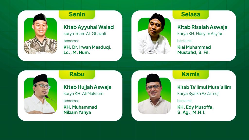 1. Kitab Ayyuhal Walad karya Imam Al-Ghazali, diajar oleh KH. Irwan Masduqi dari PP. Assalafiah Mlangi.