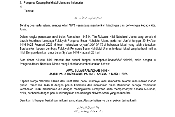Pengurus Besar Nahdlatul Ulama (PBNU) melalui Lembaga Falakiyah (LF) PBNU mengikhbarkan awal Ramadhan 1446 H jatuh pada besok, Sabtu 01 Maret 2025. Ikhbar tersebut didasarkan atas hasil rukyatul hilal pada Jum’at (28/02/2025) petang di Aceh. Hal ini berdasarkan surat edaran Nomor 3722/PB.01/A.I.01.47/99/02/2025 tentang ikhbar atau pemberitahuan hasil rukyatul hilal awal Ramadhan 1446 H. Adapun isi…