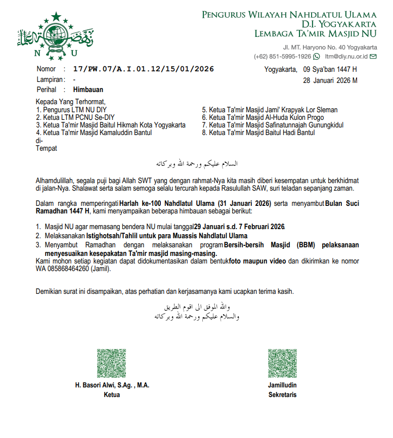 Imbauan ini ditandatangani oleh Ketua LTM PWNU DIY H. Basori Alwi, S.Ag., M.A. dan Sekretaris LTM PWNU DIY Jamiludin, serta diharapkan dapat dilaksanakan secara serentak di lingkungan masjid NU se-DIY.
